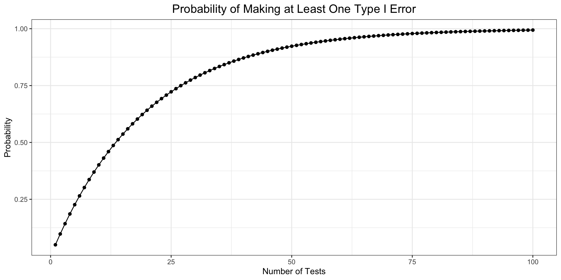 The probability of making at least one Type I error is: \[P(\text{at least one Type I error}) = 1 - (1 - \alpha)^k\] where \(k\) is the number of tests.